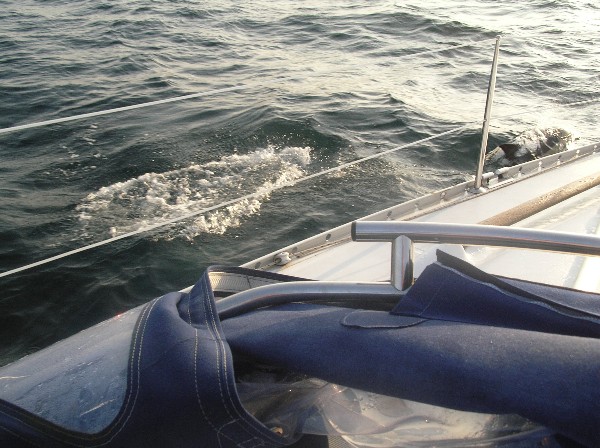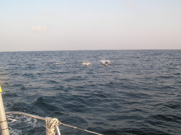 Rather like our trip back to Sicily in June, we were visited by a school of dolphins. But on this occasion, they stayed with us for almost 15mins, playing around/under/behind and ahead of the boat. No other boats were near us, and this proved to be an experience we can never forget. They tended to appear, one and two at a time, at the bow or leaping out of the water beside the boat (about 3 feet away), and then momentarily disappearing. It was quite difficult knowing where and when they would next appear, and at one time we thought they had left us - only to spot the whole 'squadron' heading towards us at speed, in formation, leaping out of the water as they hurtled at the boat, and underneath it. Initially I did not worry about taking photographs, preferring to enjoy the display myself, but after 10 minutes I did my best to capture something of it on camera. This proved very difficult, having to guess where they'd appear, and hoping the camera shutter would react fast enough. Consequently, I only have two shots I can include - the first showing 3 members of the formation squadron heading towards us, and the second showing one dolphin at the bow, and the splash of a second as it disappears below the waves. In retrospect, I should have put the camera into 'movie' mode, but the memory of those magic moments will remain with us. Truly amazing.