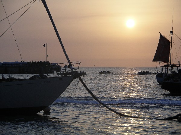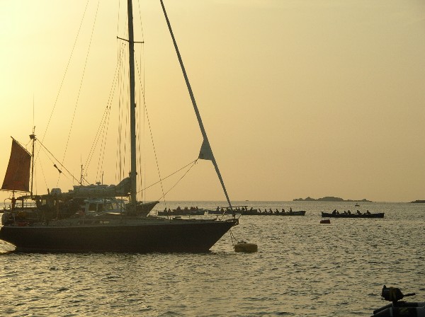 After we got back to The Raymond, still on its mooring buoy at St Mary's, we were treated to one of the tradditional, and fiercly contested inter-island Gig Races. Navigation around the Scillies can be extremely hazardous, and many years ago, the crews of these boats used to race to vessels approaching the islands in order to be the first to put a pilot aboard, and therefore collect the fee. The 32ft wooden gigs, some of which are over 100 yrs old, are raced every week during the season with an appreciative crowd following in passenger boats. The male crews race on a Friday evening, female crews on Wednesdays, and so we saw one of the woman's races. The first picture shows the start, and the second shows the winning crew crossing the line, late in the evening, after a race lasting about 15mins.