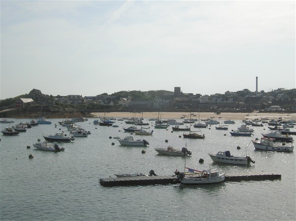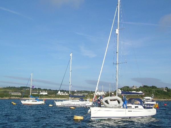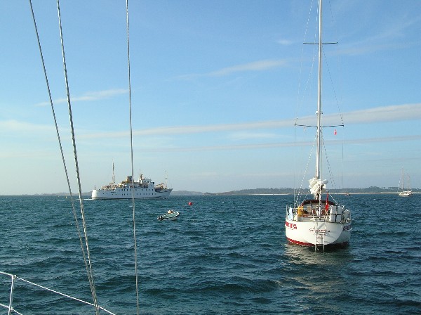 After quite a bumpy (but uneventful) ride across to The Scillies we found our way into Hugh Town, St Mary's Pool, soon after lunch time and managed to pick up a mooring buoy at our first attempt (well done Jenny!). Unless you've tried it, you won't appreciate that it can be quite tricky, both for the person at the helm, and the person at the bow wielding the boat hook. Once the buoy is hooked, a line must be secured pretty quickly as the boat will be blown away from the buoy by the wind (and/or carried by any tide stream) and holding it with just the boat hook can be difficult. The first picture shows the St Mary's to Newlyn ferry heading back to the mainland, and the second shows some of our new neighbours.